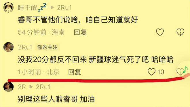 而在对阵青岛队的这场比赛投篮10中4手感冷凉,并且在关键时刻两罚尽失的北京首钢队后场绝对主力赵睿,输掉比赛后的心情本来应该就不太好,所以当他看到前东家新疆队的球迷留言评论他现在所效力的北京首钢队本赛季的争冠前景以及他的个人表现后火气一下子就上来了,立马怒怼了回去。