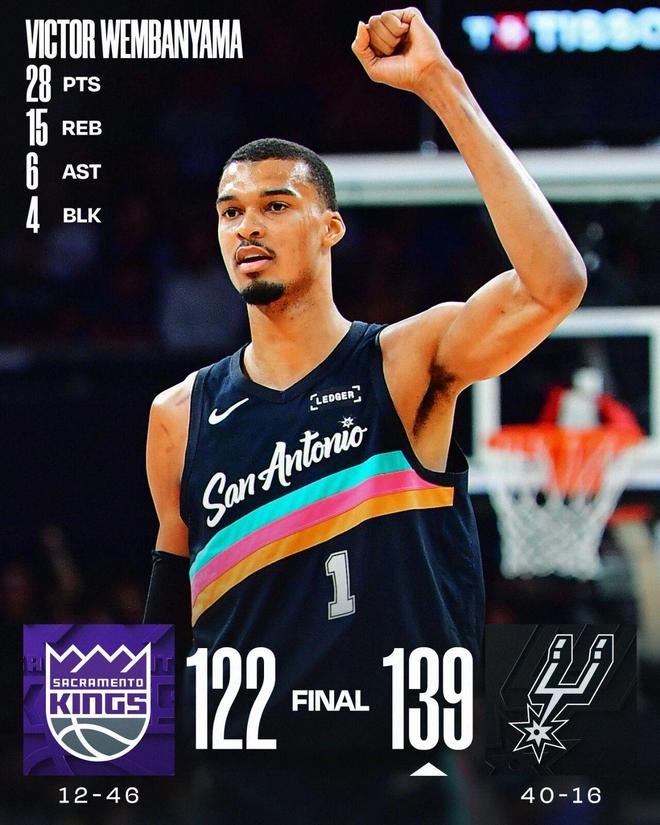 常规赛,马刺主场139-122战胜国王。