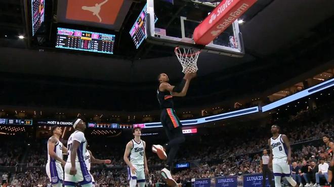 ——第二节剩下50秒,文班亚马45度外拿到球,看到防守的是克利福德,直接突到内线扣篮,再一次,补防的基根穆雷还有阿丘瓦无能为力