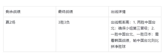 中国队的1胜若赢在中国台北男篮身上,日本男篮则会至少3胜晋级,中国队想要晋级就必须满足中国台北男篮剩余两场全输(韩国也能3胜晋级),且净胜分小于中国队。