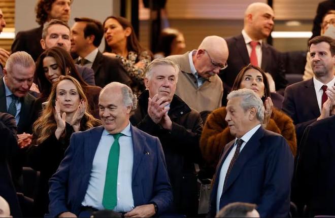 现任巴西队主教练的安切洛蒂,此前已于上周六现身伯纳乌观看皇马对阵莱万特的联赛,本场欧冠他再次来到现场,并在贵宾包厢中关注着这支他曾长期执教的球队。66岁的安切洛蒂依旧密切关注着“他的”皇家马德里。