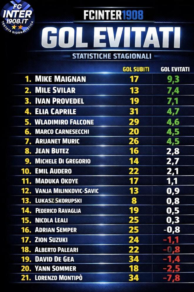 意甲门将阻止预期进球榜:迈尼昂9.3第一,索默-2.5倒数第二