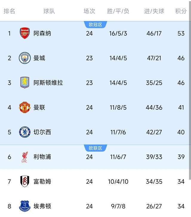北京时间2026年2月2日消息。英超迎来第24轮的焦点战,曼联坐镇主场迎战富勒姆。经过90分钟激战,红魔在2-0领先的情况下,被对手在5分钟内连追2球,打成2-2。第93分钟,谢什科绝杀破门,3-2,曼联获胜。——这样在积分榜上,曼联拿到41个积分,超越40分的利物浦、39分的切尔西,排名第4。在新帅卡里克带领下,曼联一扫此前阿莫林执教时的阴霾,重新振奋起来,看到了冲击欧冠资格的可能。