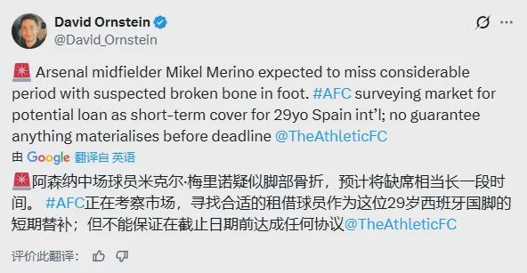 赛前,主帅阿尔特塔确认,梅里诺将接受专家诊断以确定伤势严重程度。尽管具体伤情细节尚未完全确认,但枪手方面担心梅里诺可能面临长期伤停,据悉他脚部一处骨头骨折,这无疑给球队的争冠前景蒙上了阴影。