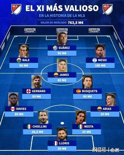 德转列美职联球员、以及曾在美职联效力的球员身价最贵阵,梅西1.8亿欧领衔,苏亚雷斯、贝尔、杰拉德、J罗、布斯克茨在列,中卫组合则是基耶利尼+内斯塔。