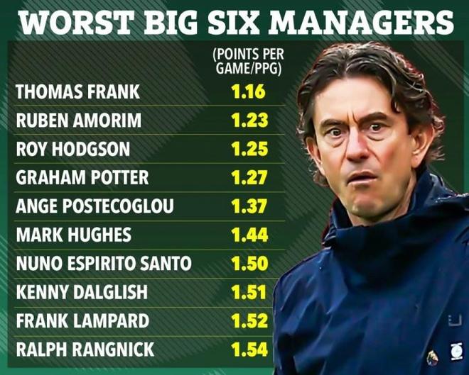 英超“Big Six”最差主帅(场均积分PPG)