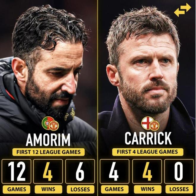 外媒流传的两张统计表,一张强调“接手初期的连胜”,另一张强调“长期联赛拿分效率”。把两张表并排看,反差就出现了:卡里克带曼联联赛前4场全胜;阿莫林带曼联联赛前12场只赢4场、还输了6场(剩余为平)。同样是曼联,开局阶段的节奏差得非常明显。